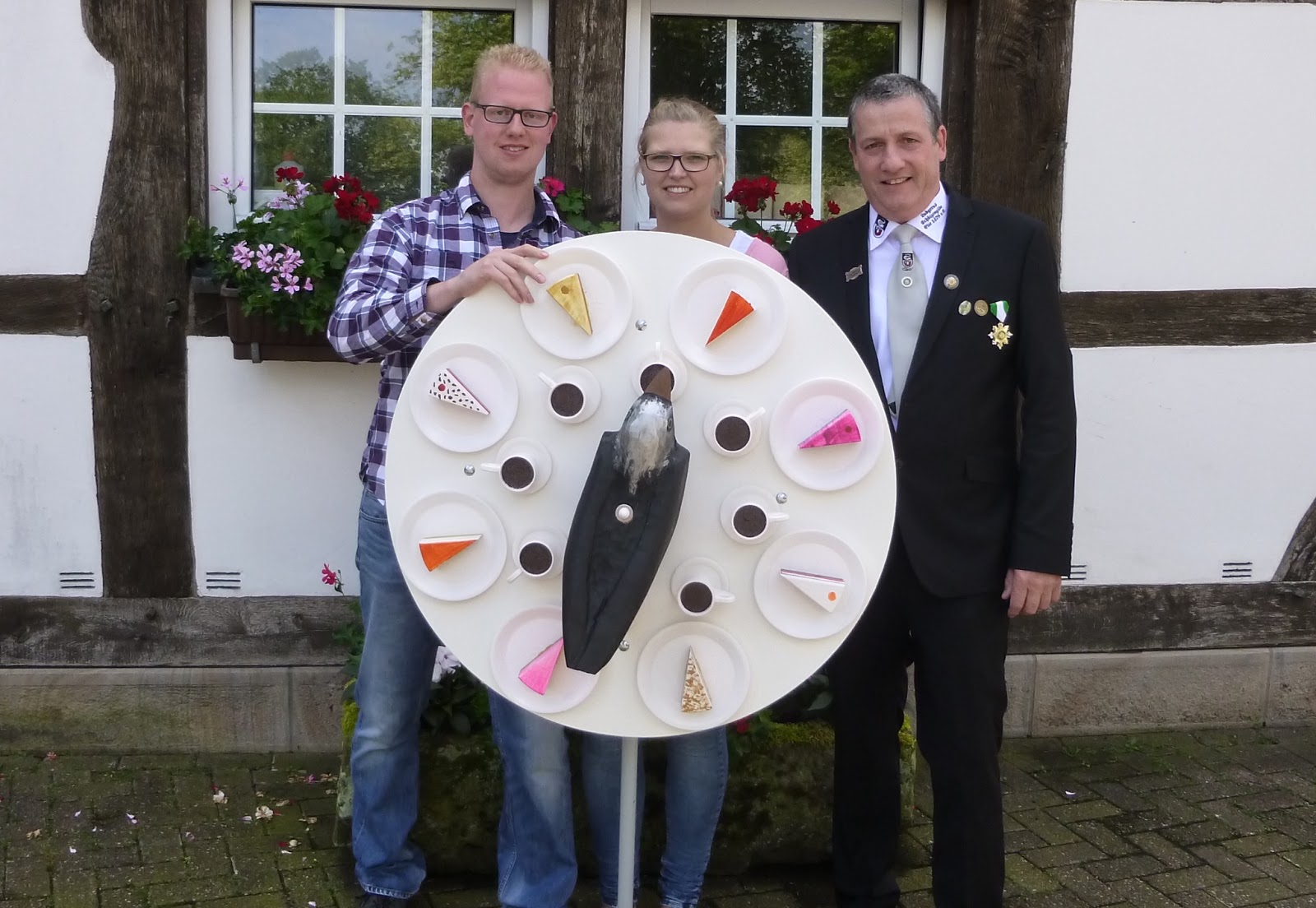 Zwar ist der Vogel selbst relativ schlicht gehalten, dafür macht die Kuchentafel auf der gefüllte Kaffeetassen und Teller die mit bunten Kuchen bestückt sind, umso mehr her. „Auf so eine Idee muss man erst mal kommen“, lobte Oliver Glasmeyer seinen Königsvogel. Die Schützenbrüder hoffen jetzt natürlich, dass es nicht wieder 835 Schuss dauert, bis das letzte Stück Holz aus dem Kasten fliegt. Schießwart Henny Sprengers hat aber auf alle Fälle seinen Vorrat an Munition reichlich aufgefüllt, so dass das Federvieh beim Schützenfest im Schrot-Feuer der Königsanwärter am Ende auf alle Fälle den Kürzeren ziehen wird.